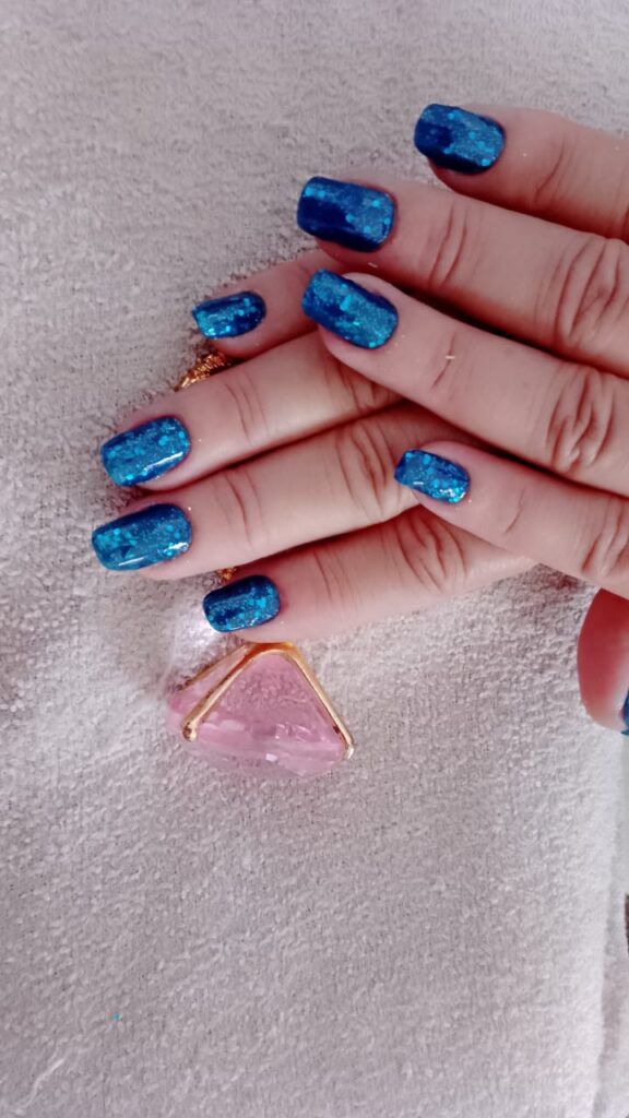 Essa tonalidade de azul com acabamento vitrínico é uma opção ousada e sofisticada. O glitter adicionado traz um toque de glamour e modernidade, fazendo dessa manicure uma escolha perfeita para brilhar nas festas de fim de ano.