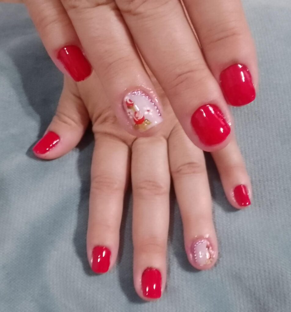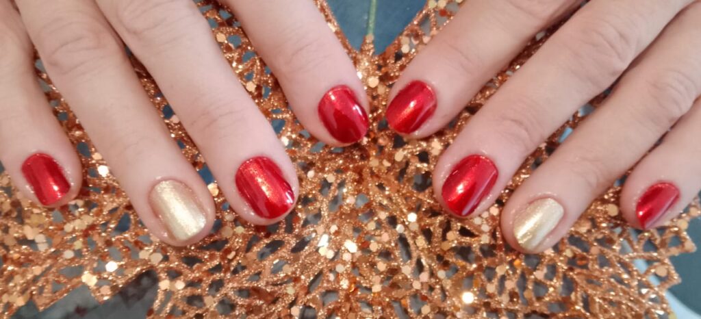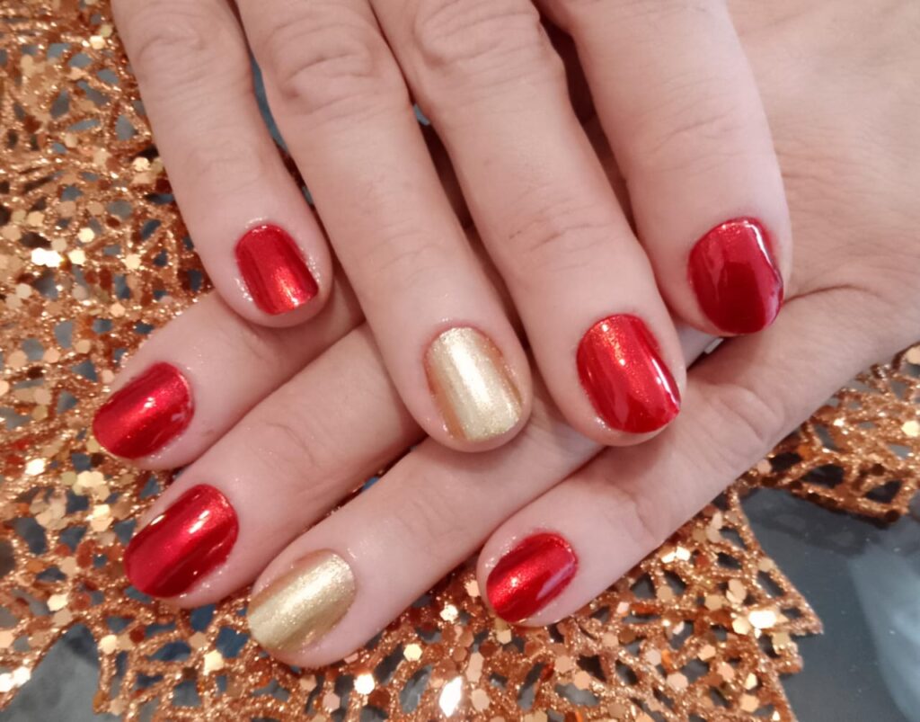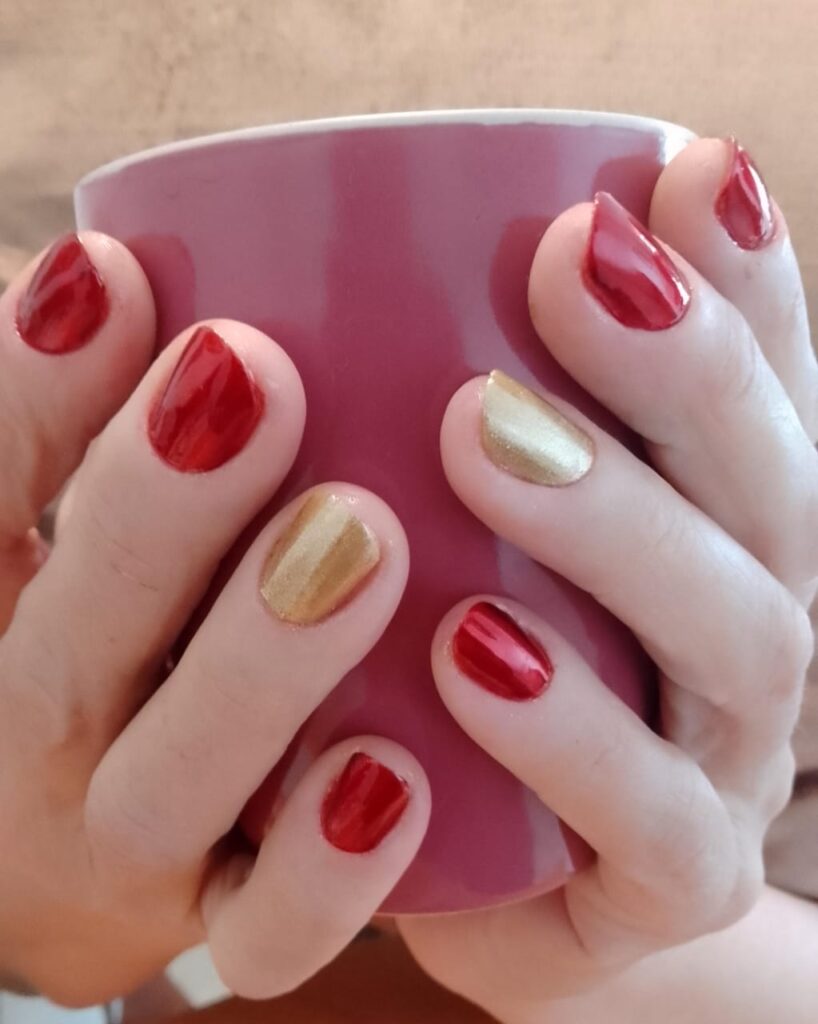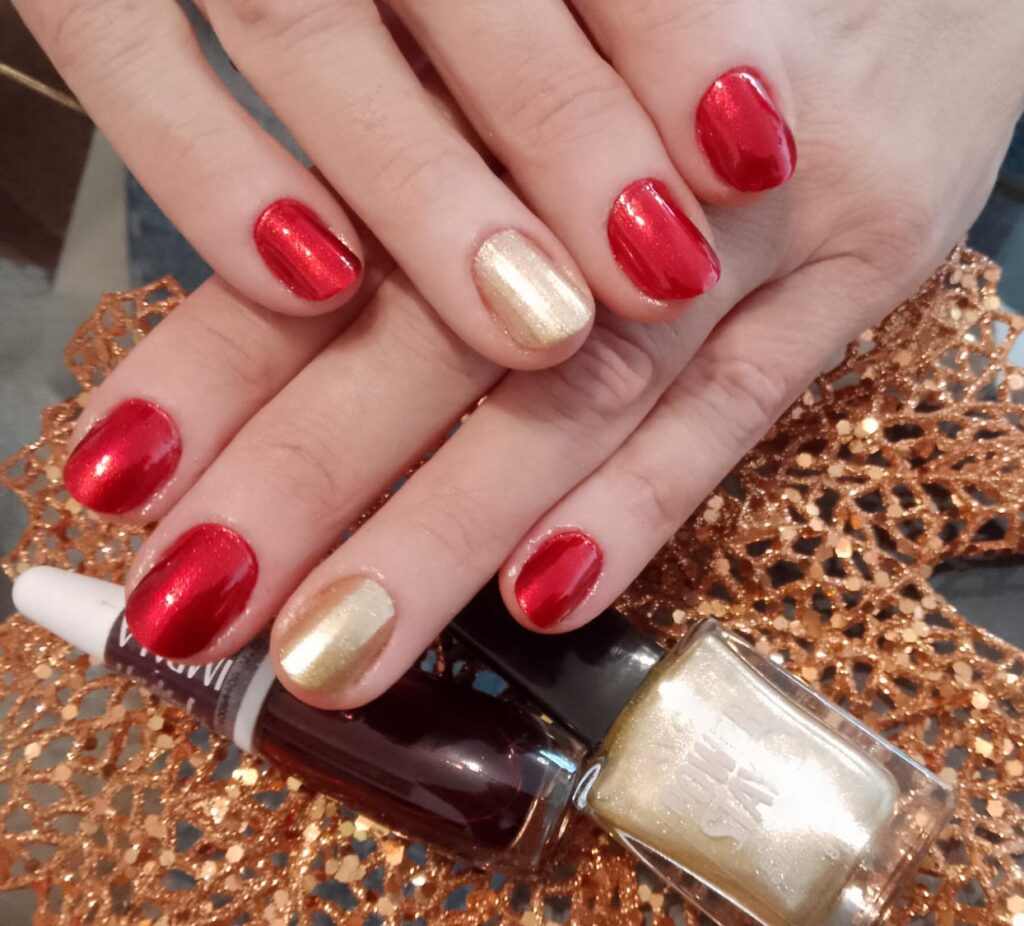 A combinação de vermelho com dourado é clássica e atemporal. Nessa versão, a filha única dourada é o ponto alto, adicionando brilho e requinte à manicure tradicional.