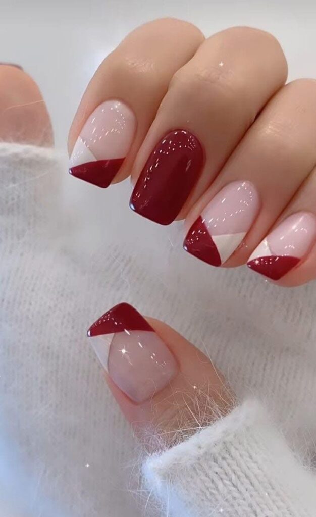Para quem gosta de ousar, as unhas decoradas com desenhos geométricos são uma ótima escolha. Linhas retas, quadrados e triângulos em contraste com o vermelho deixam o visual moderno e criativo. Você pode até usar fitas metálicas para criar esses desenhos de forma fácil e precisa.