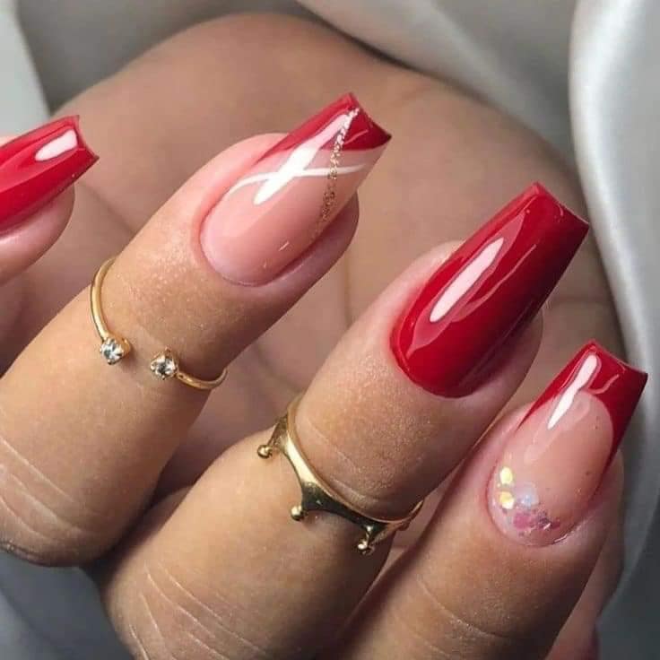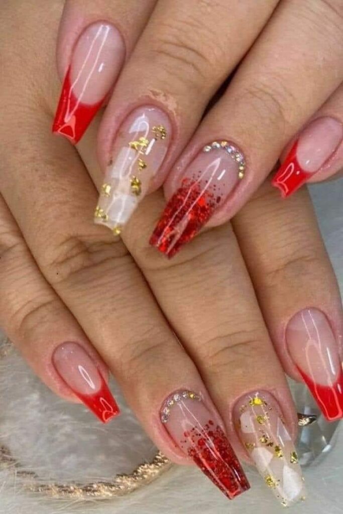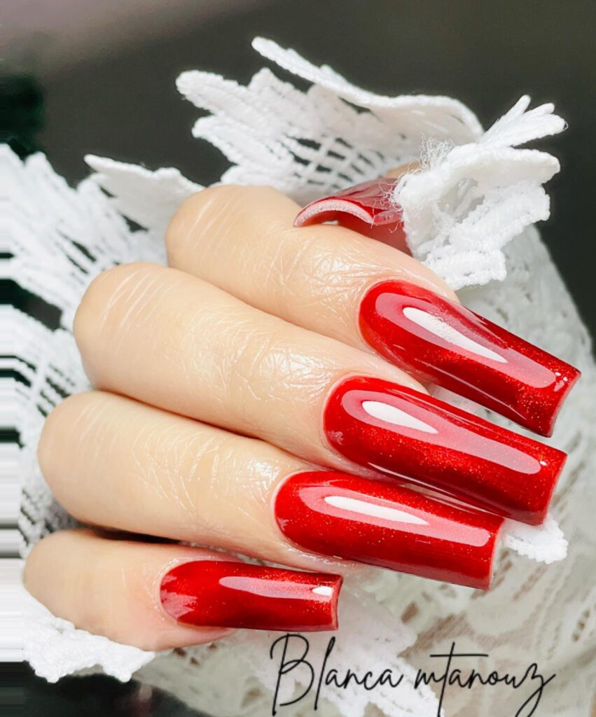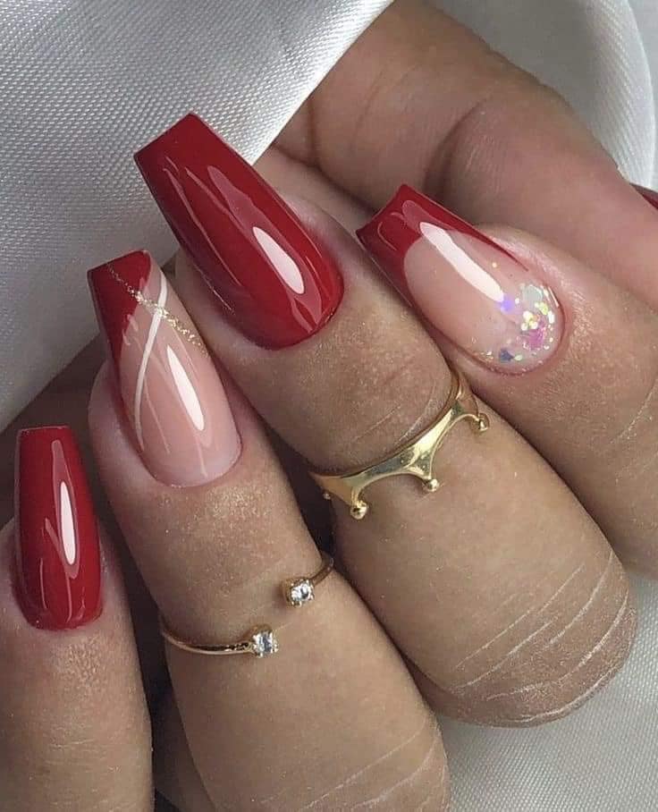 O brilho nunca sai de moda! Adicionar glitter nas pontas das unhas ou aplicar uma camada de glitter holográfico sobre o esmalte vermelho pode transformar suas unhas em uma verdadeira obra de arte. Perfeito para festas e ocasiões especiais!