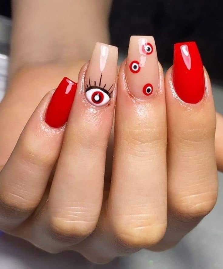 Uma decoração simples e divertida, mas que dá um toque especial ao visual, são os pontos de cor. Você pode criar pequenos círculos em cores contrastantes como branco, dourado ou até mesmo outros tons de vermelho, e espalhá-los por toda a unha ou apenas na ponta.