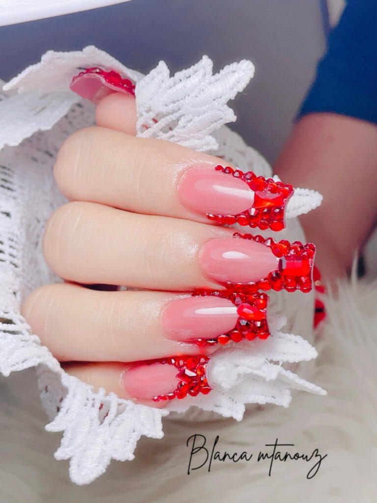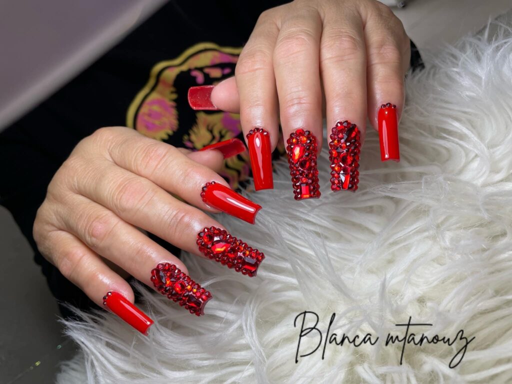 Se você adora brilho, os strass são a escolha perfeita para decorar suas unhas vermelhas. Aplique pequenos cristais nas pontas ou no centro da unha para um look glamouroso e cheio de charme. Perfeito para um evento especial ou uma noite de festa!